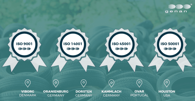 As a part of Genan’s strategic and persistently systematic work on Quality, Environment, Health & Safety and Energy Management, we follow the requirements outlined in the following four international standards: ISO 9001 (quality management), ISO 14001 (environmental management), ISO 45001 (occupational health and safety management) and ISO 50001 (energy management). Thanks to operational excellence and cross-factory knowledge sharing as well as the determined efforts of Genan staff at all locations, we have managed to achieve these globally valid certifications of our six tyre recycling plants. In December 2021, all six factories were audited by certification company GUTcert, and we now proudly present the result: four separate ISO certifications, each covering all six Genan plants. These four ISO certificates illustrate the strict requirements we impose on ourselves in respect of both quality, workplace safety, environmental responsibility as well as when it comes to structuring our energy management for energy-saving operation at all Genan plants –striving for a sustainable future. Find the certificates here.
